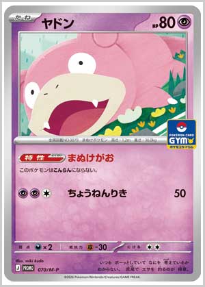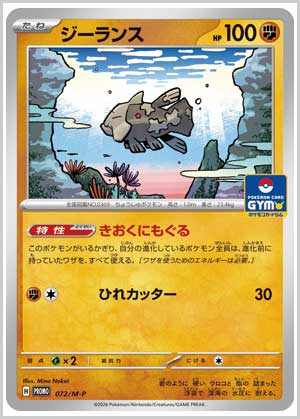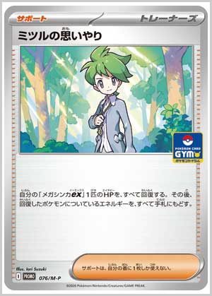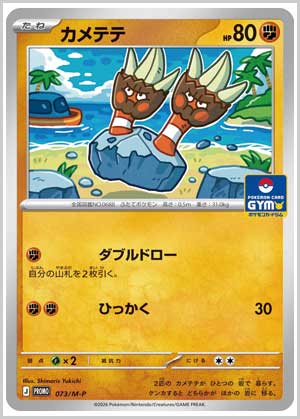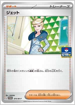 | 入手方法 | 2026年2月1日(日)~全国のポケモンカードジムで開催されている「ジムバトル」などに参加したり、勝利するともらえる「プロモカードパック第3弾(全7種)」から入手できる。プロモカードパックは1パック2枚入りと1パック1枚入りの2パターンが用意されている。 |